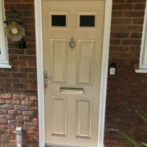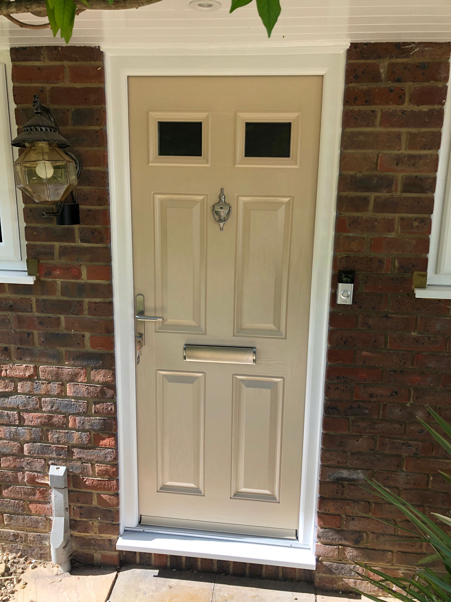 Honey Beige, Magnum 2 Composite Door with Stippolyte obscure glass and Satin silver furniture, installed in Ightham.